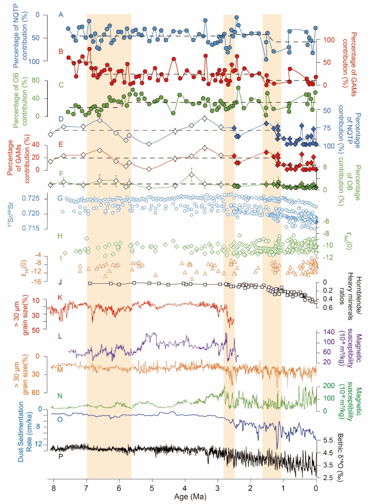 图2. 约800万年以来黄土高原沉积物锆石年龄谱变化指示的物源变化及与全球温度、海平面、亚洲季风气候变化的联系