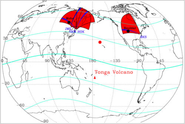 2022年1月15日,南太平洋岛国汤加的洪阿哈阿帕伊岛(Hunga Haapai)海底火山发生猛烈喷发,引发海啸,并引起了强烈的电离层震荡。中国科学院院士、中科院国家空间科学中心太阳活动与空间天气重点实验室研究员王赤团队的研究员张佼佼与徐寄遥等合作,利用相干散射雷达和数字测高仪探测到此次火山爆发引起的北半球两组特征明显不同的电离层震荡。第一组电离层震荡比引起海啸的大气压力波提前3个多小时被观测到。研究发现,第一组电离层震荡的源区在火山爆发的北半球共轭点,火山爆发产生的电场通过磁力线共轭作用被迅速传递到北半球共轭点并造成北半球电离层震荡。在这一阶段,亚洲扇区高频雷达探测到最大的电离层震荡多普勒速度超过100m/s,发生在电离层F区。探测到的第二组电离层震荡源区在火山爆发处,主要由火山爆发产生的大气压力波直接传播到北半球,由大气中性成分与电离成分相互碰撞所致,这一阶段最大电离层震荡多普勒速度超过150m/s,发生在电离层E区,电离层震荡速度随高度升高而减弱。此外,该研究通过高频雷达与数字测高仪联合观测发现,火山爆发引起的电离层垂直高度最大抬升约100公里,电离层最大垂直运动速度超过60m/s。