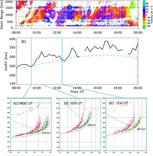 图2.高频相干散射雷达与数字测高仪联合观测火山爆发引起的电离层震荡。