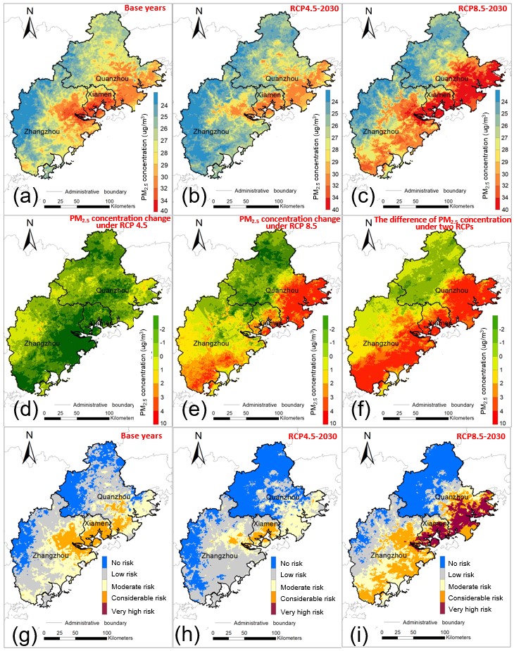 图1 闽三角城市群基准年和2030年不同RCP情景下的PM2.5浓度变化及生态风险分布