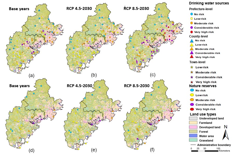 结果表明,RCP 8.5情景下PM2.5污染生态风险的变化幅度和空间差异明显较RCP 4.5大,这是土地利用变化和气候变化的共同作用结果(图1)。其中,闽三角城市群的建设用地、水域和农田的生态风险高于草地和森林。特别要警惕的是在预测中,基准年和2030年的沿海饮用水源地均处于中高风险状态(图2和图3)。