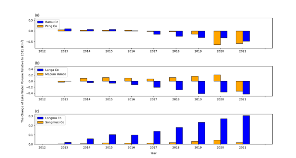 该工作定量解析了三个位于不同气候区的湖泊水量变化,评估了不同气候因子对湖泊水量变化的影响,为定量研究不同气候因子对湖泊变化的贡献度提供了重要科学依据。近日,相关研究成果以Interannual and Monthly Variability of Typical Inland Lakes on the Tibetan Plateau Located in Three Different Climatic Zones为题,发表在Remote Sensing上。研究工作得到国家自然科学基金、第二次青藏高原综合科学考察研究和中科院的支持。