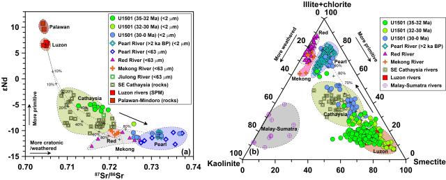 分析结果显示(图2),南海北部U1501站位粘土粒级陆源组分的物源在3200万年前至3000万年前发生了明显变化。通过与周边潜在源区端元对比,我们认为研究区沉积物在3200万年之前主要是来自于华夏地块东南沿岸以富蒙脱石和εNd值相对偏正为特征的风化产物,而从3000万年前至今则转变为来自于华南地块内部(扬子地块为主)以富伊利石和εNd值相对偏负为特征的物质。华夏陆块沿岸地区的基岩以古生代-中生代花岗岩和火山岩为主,其组成受到了古太平洋板块俯冲的地幔物质显著影响;而华南内陆即扬子地块作为古老克拉通,以中生代沉积岩和变质岩为主。二者风化产物因而具有明显不同的放射性成因Nd同位素组成及粘土矿物组合。