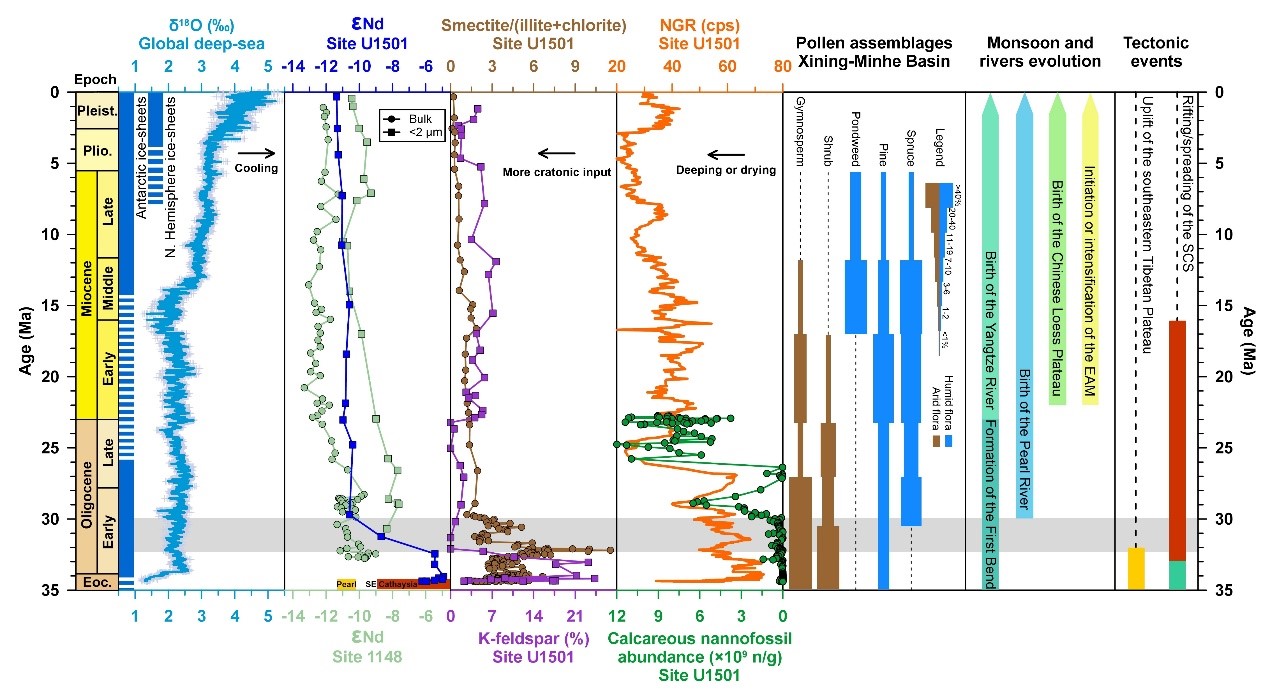 研究人员通过南海北部的陆源碎屑沉积记录约束了过去3500万年以来研究区沉积物物源演化,揭示类似现代规模的珠江流域形成于约三千万年前,源于青藏高原东南部隆升和中国东部地形倒转。