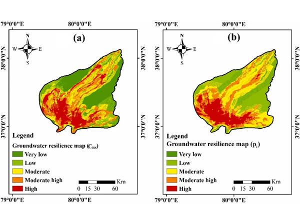 图2. 基于Dempster-Shafer模型的地下水恢复力空间分布:(a) CRS, (b) pi.