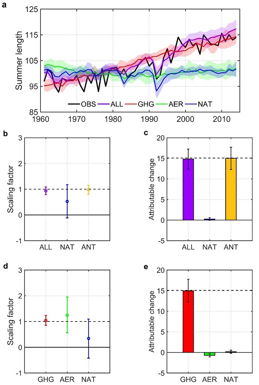 气候变化主要是由气候系统内部变率(ENSO等),自然外强迫(火山,太阳活动等)和人为外强迫(温室气体,人为气溶胶等)共同引起的。近年来,气候变化研究主要使用检测和归因方法识别长期气候平均状况或极端气候事件中人类活动影响的信号,这一主题也已经成为当前气候变化研究领域的热点之一。最新研究发现,伴随着全球变暖的持续,全球夏季的温度和持续时间显著增加,然而目前尚缺乏利用最优指纹法等检测归因方法对夏季长度的变化进行检测与归因。