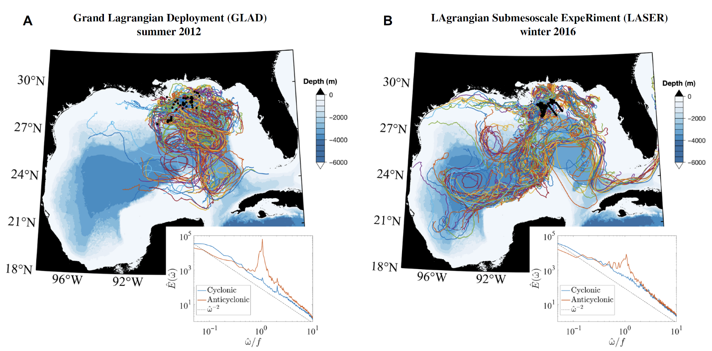 图1. 浮标的空间分布。图中黑点是浮标的初始位置,彩线是浮标的移动路径;小图是对应的拉格朗日频率谱。A和B分别展示夏天和冬天的两组观测