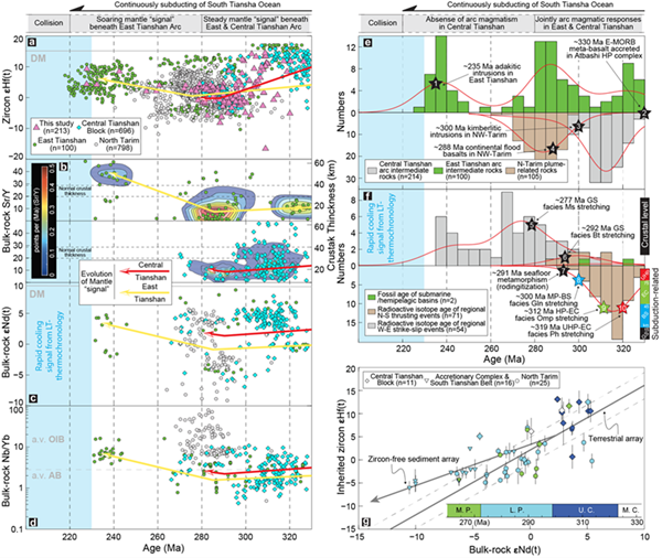 研究表明,该弧前增生盆地主要碎屑物源不是来自北边的哈萨克斯坦-伊犁-中天山大陆或南边卡拉库姆-塔里木克拉通,而可能来源于东天山的三叠纪弧岩浆(图2a、e)。因此,该盆地主要碎屑物源可能由等深流(Contour current)搬运自较为远端的东天山弧(图1e),据此可制约关于古亚洲洋西南缘的南天山洋闭合时限。中二叠世MOR型蛇绿岩(中天山东部冰达板地区)以及晚石炭和晚二叠纪放射虫化石(吉尔吉斯坦和境内南天山区域),进一步暗示着一个更年轻的洋盆存在的可能性(图2f)。该洋盆或延伸至三叠纪早期,等深流能够从较为远端的东天山弧搬运碎屑物质,形成现今所看到的阿克牙孜超高压变质杂岩带中的弧前增生盆地(图3)。这与区域上广泛分布、与中亚造山带南缘最终拼合相关的三叠纪低温热年代学冷却“信号”相互印证(图2)。结合在南天山、东天山、内蒙古中部及索隆克尔缝合带地区的三叠纪增生盆地的报道,研究显示,整个古亚洲洋在中亚造山带西、中和东部或是近同期闭合。这进一步指示俯冲相关的岩浆作用在南天山造山带西部和东部区域的时空分布存在显著差异(图3)。其中,西部由于泥盆-石炭纪海山链的持续俯冲以及克拉通微陆块的存在,孕育形成平板俯冲构造及其对弧下地幔楔的圈闭,其岩浆作用在300-230百万年期间基本停止;而东部弧岩浆作用从330百万年直至洋盆关闭持续存在。