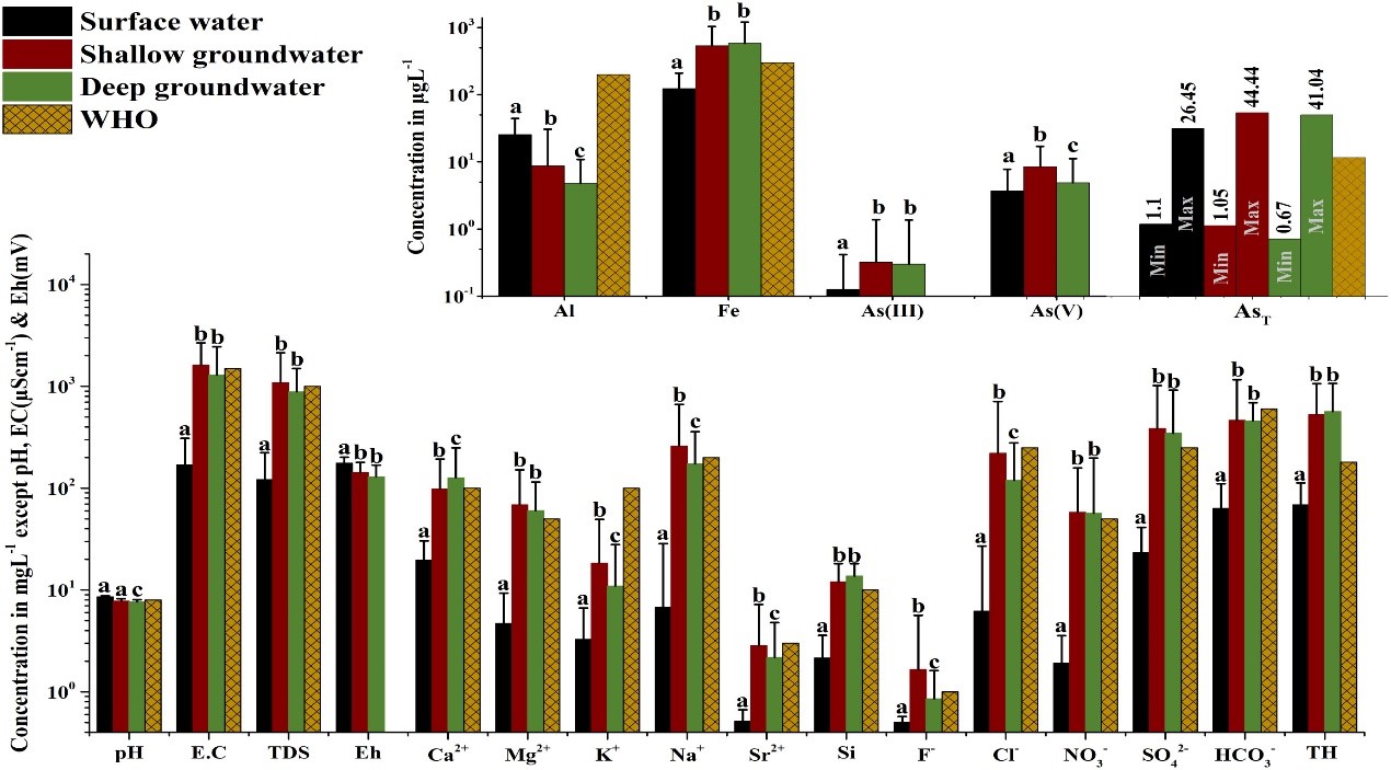 水化学特征方面(图1),巴基斯坦印度河中上游地区水体呈中性至强碱性和氧化状态。部分区域的水体特别是地下水,总溶解固体浓度(TDS)和总硬度(TH)超过了世界卫生组织(WHO)饮用水标准。对于砷元素,31%的浅层地下水(SGW)砷浓度超标,其次是深层地下水(DSW,14%)和地表水(SW,4%)。