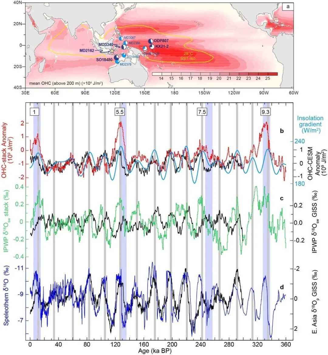 翦知湣教授团队首次利用暖池区10个深海沉积岩芯中的浮游有孔虫微体化石,重建了过去36万年以来上层海水(0至200米)热含量的变化,发现暖池热含量的重建记录与地球气候系统数值模式瞬变模拟的热含量曲线变化形态和幅度非常一致。团队还重建了暖池区表层海水的剩余氧同位素,其结果与暖池热含量变化一致,两者在岁差周期上均与中国石笋记录的大气降雨氧同位素呈同步变化:即暖池热含量增大,对应海水剩余氧同位素变重、而石笋氧同位素变轻(图2和3)。