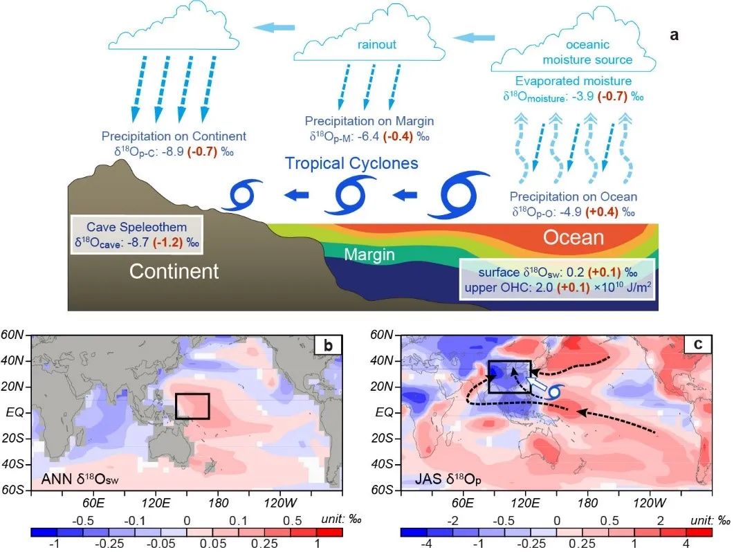 此研究综合利用现代观测、古环境替代指标、以及海气耦合模式和水同位素数值模式的瞬变模拟(图3),从暖池区上层海洋热含量(而非表层海水温度)的角度探索水汽潜热传输,通过海陆之间的水同位素梯度来衡量全球季风水循环强度,不仅拓展了古海洋与古气候的能量学研究新领域,也可为现代和未来气候变化提供“以古论今”的新思路。