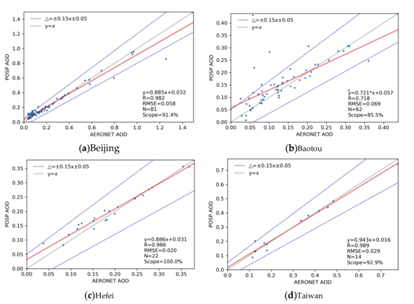 研究人员利用搭载在高光谱观测卫星(GF-5B)上的高精度偏振扫描仪(POSP)的观测数据对该算法进行了验证。与不同地区气溶胶自动观测网(AEROENT)站点的AOD产品比对结果表明,该算法能反演不同地表上空的AOD;与中分辨率成像光谱仪(MODIS)的AOD产品进行比对,验证了算法在不同污染条件下的有效性。