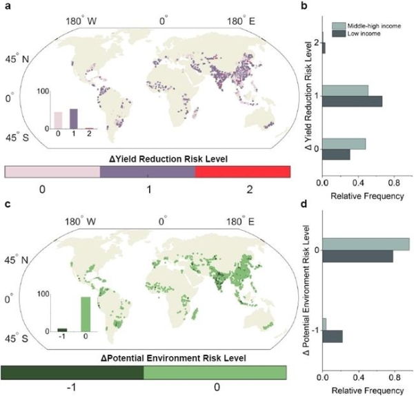 基于长期FACE试验得到的有效磷显著降低结果,结合全球历史土壤磷平衡数据,研究人员进一步对未来CO2升高背景下全球稻田土壤磷进行预测。研究发现,全球大部分稻田目前均处于磷亏损状态,约35%的稻田面积面临着极高的减产风险,约15%的稻田面积面临着磷流失面源污染风险。如果未来CO2浓度持续升高,由于土壤有效磷降低导致的全球水稻减产风险的面积将会增至55%,低收入国家将面临着更大的减产风险(增至70%面积),中高收入国家由于相对较高的土壤累积态磷和磷肥资源,减产面积约为52%;同时全球稻田磷环境流失风险面积将降低至9%。总体而言,未来CO2浓度升高对稻田磷循环的影响是一把“双刃剑”:缓解全球稻田的磷环境污染问题,但对粮食安全威胁更大。因此,研究认为,保证全球稻田磷平衡是应对粮食安全亟需采取的重要措施之一。该研究为气候变化下全球磷肥的应对策略及生态环境效应评估提供了理论与科学依据。稻田磷的可持续管理也应成为气候变化应对战略的重要内容。