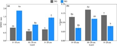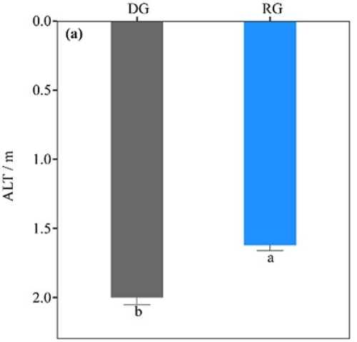 中国科学院西北生态环境资源研究院科研团队在青藏高原东北缘疏勒河源多年冻土区极重度退化草地开展相关研究,首次通过对比分析2017-2020年极重度退化草地(DG)和人工建植草地(RG)的活动层厚度、土壤冻融过程和团聚体特性,发现:0-10 cm深度土壤完全冻结期开始时间提前17天,完全融化期开始时间延迟18天(图1)且完全冻结天数显著增加47天,而2 cm深度冻融日显著减少且冻融强度减弱;活动层厚度明显减薄(图2);0-20 cm深度土壤团聚体平均重量直径显著增大且抗侵蚀能力明显增强(图3)。由此表明,极重度退化草地的植被重建措施可明显提升多年冻土稳定性。该研究可为高原极重度退化草地的多年冻土保育技术研发提供数据支撑和科技示范,并有助于实现气候变暖背景下高寒草地生态系统服务功能的稳定和提升。