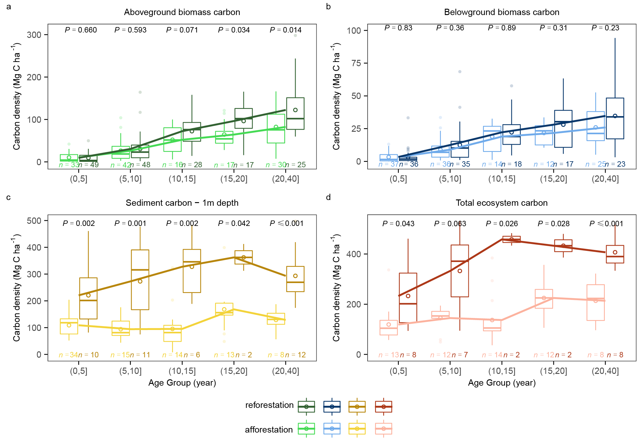 图1.40年内红树林再造林与造林的各碳库碳密度累积对比图