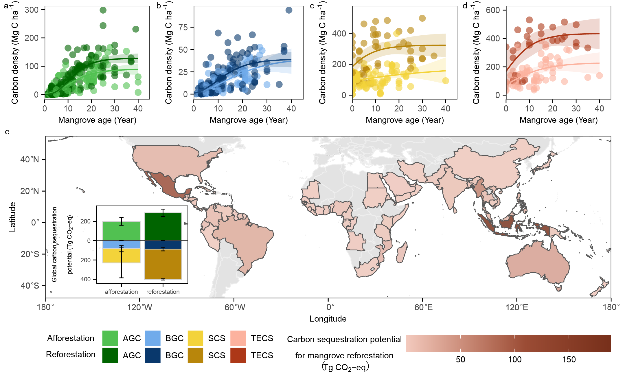 图2.全球在未来40年内实施红树林造林和再造林项目蓝碳固存潜力评估结果