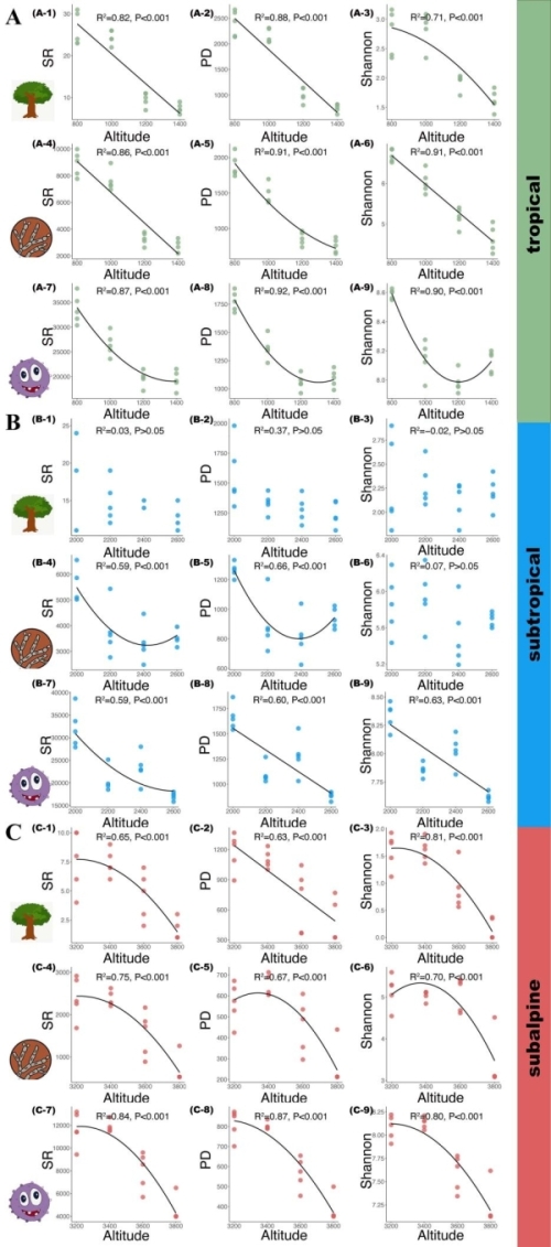 三个气候带树木、真菌和细菌多样性的海拔分布格局。A:热带;B:亚热带;C:亚高山。A(1-3)、B(1-3)、C(1-3):树种; A(4-6)、B(4-6)、C(4-6):真菌;A(7-9)、B(7-9)、C(7-9):细菌。SR:物种丰富度;PD:系统发育多样性;Shannon:Shannon-wiener指数。