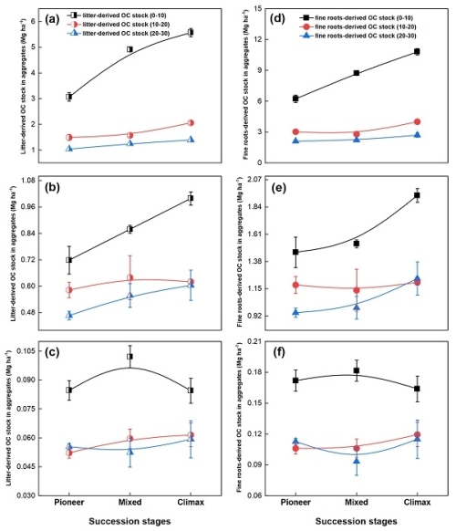 研究发现:团聚体碳流路径遵循从大团聚体向粘粉粒径流动的趋势,同时,在森林演替过程中,表层土壤的碳流强度逐渐降低(图1);植物衍生碳主要被固定在大团聚体中,演替至顶级林阶段时,表层土壤中植物衍生碳对各粒径团聚体碳库的贡献分别为大团聚体(30%)、微团聚体(27%)、粘粉粒径(25%);在所有情况下,细根对团聚体碳库的贡献均大于凋落物(图2、3)。研究发现微生物量碳是控制细根衍生碳储量的关键因素,这进一步表明微生物在植物碳输入流向土壤碳库过程中发挥核心作用。该研究为阐明长期植被演替过程中土壤有机碳稳定路径及其驱动机制提供了理论依据。
