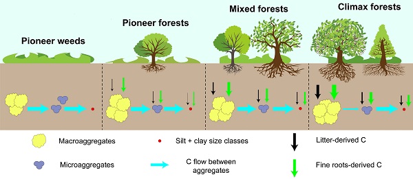 图3.长期森林演替下土壤团聚体碳流过程概念模型