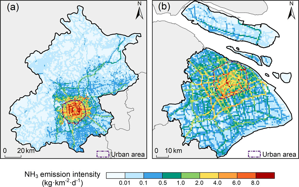 图2.北京和上海机动车NH3排放强度空间分布特征