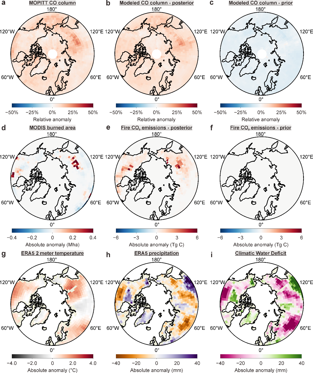 图2.相对于2000-2020年均值,2021年北纬50°以北区域大气中CO柱浓度、野火CO2排放及气象参数距平
