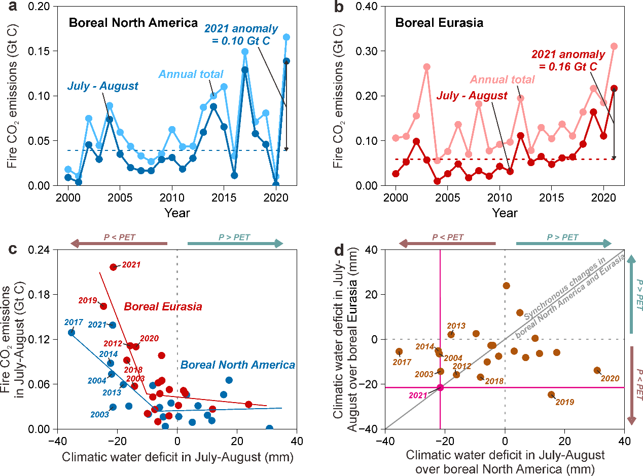 图3.北美及欧亚大陆北方森林区域野火CO2排放及与土壤水分亏缺的关联分析