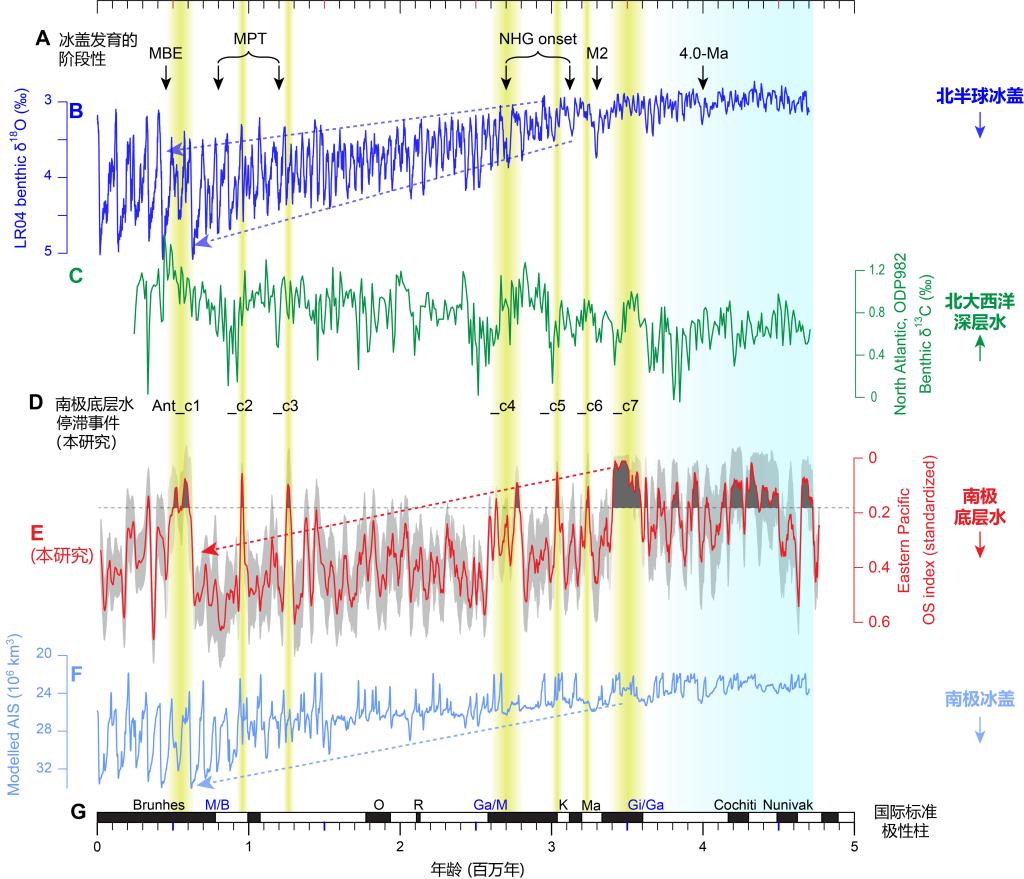 此外,研究人员还识别出7次南极底层水的停滞事件(Ant_c1~c7),并与北半球冰盖发育的关键阶段(M2、NHG onset、MPT、MBE)一一对应。通过分析不同时期底层水停滞的可能机制,该研究推测:南极底层水的停滞可能联合北大西洋深层水的增强,共同为北半球冰盖的阶段性发育提供必要的水汽支持。