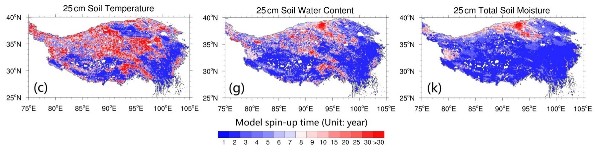 (以25厘米深度土壤温度、土壤含水量以及包含液态水和固态冰的土壤湿度为例)。在多年冻土区和较干旱的柴达木盆地需要较长的时间达到模拟的平衡态。