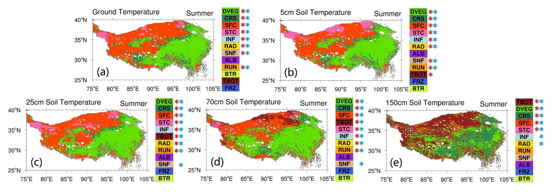(以夏季地表和土壤温度为例),图中(a),(b),(c),(d),(e)分别对应地表温度和5厘米、25厘米、70厘米及150厘米深度土壤温度最敏感的参数化方案。图中右侧色标顺序由上至下为变量对不同类型参数化方案的敏感性降序,星号为对敏感性的显著性检验。由图可以看出夏季地表和土壤温度对与能量传输相关的地表拖曳系数(SFC)、土壤温度时间方案(STC)和土壤温度下边界条件(TBOT)以及与植被相关的动态植被(DVEG)和冠层气孔阻抗(CRS)方案的敏感性较高,但敏感性存在明显的空间差异。