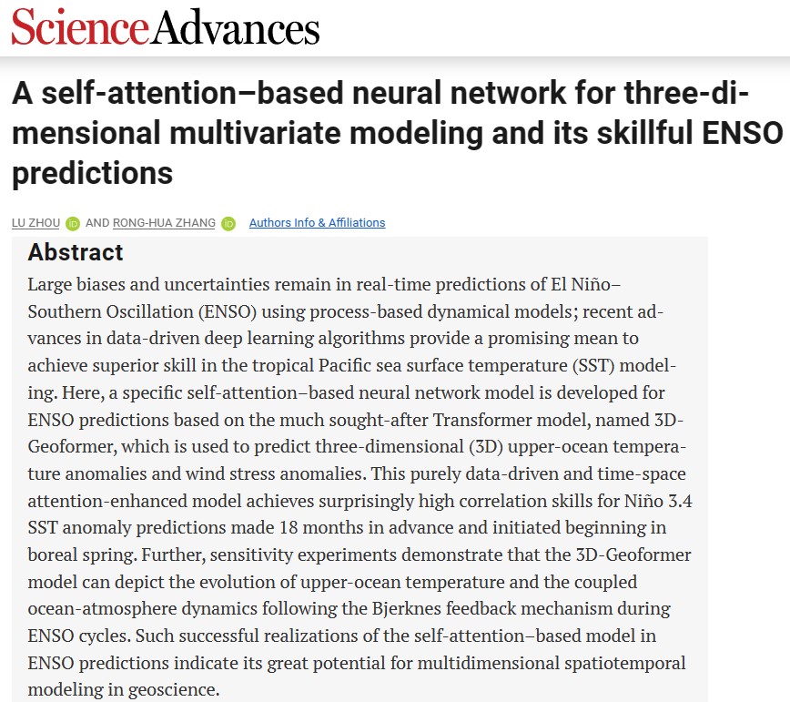 Zhou, L., and R.-H. Zhang, 2023: A self-attention based neural network for three-dimensional multivariate modeling and its skillful ENSO predictions. Science Advances, 9, eadf2827, https://doi.org/10.1126/sciadv.adf2827