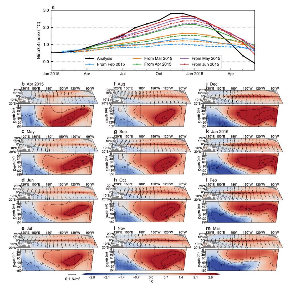 (a)不同月份开始预测得到的Nino3.4区海温异常及再分析结果(其中虚线为热带太平洋风应力影响去除后的试验结果);(b-m)为从2015年4月起开始预测得到的风应力及上层海洋三维温度异常场的时空演变