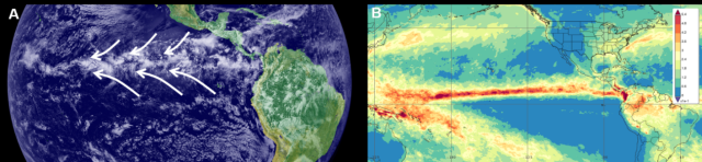 图1. 热带辐合带。A:2000年7月卫星云图,白色为云团,白色箭头代表南北半球信风;B:年平均降水,单位:0.54 mm hour-1
