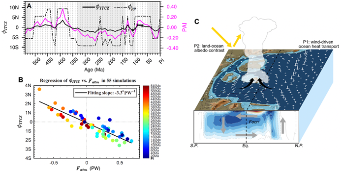图2. (A) 5.4亿年来ITCZ纬度的变迁。用三种指标表征ITCZ的纬度:纬度平均的降水重心纬度(黑实线),降水峰值的纬度(黑虚线),半球间降水的不对称性(紫线);(B)各地质时期ITCZ纬度和跨赤道大气热量输送()高度相关;(C)大陆漂移驱动ITCZ迁移机制示意图(以5.4亿年前地质时期为例):海表风应力(白色箭头)驱动的逆时针方向(和当前气候相反)的大洋环流(下图中的流函数和灰色箭头),陆地-海洋反照率对比(黄色箭头示意)