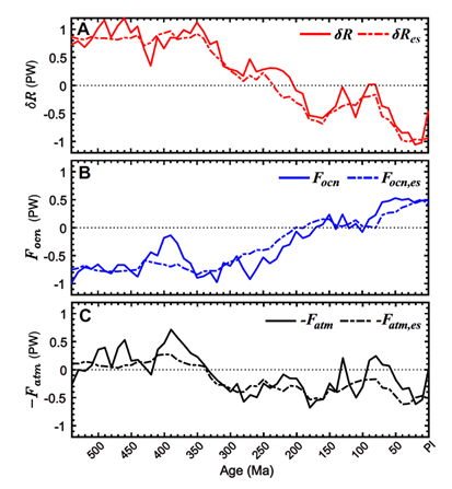 为定量计算辐射平衡和海洋热量输送,该研究构建了一个理想模型:根据海陆分布和近似的海洋和陆地上空的行星反照率常数以计算两个半球的净辐射差;根据两个半球间中纬度海洋面积差来回归出跨赤道海洋热量输送。这样,根据过去5.4亿年间的大陆分布的变化,可估算各地质时期两个半球辐射的不对称性,海洋热量输送,和大气热量输送(图3)。以上结果使得人们可以根据海陆分布来理解大陆演化对全球海洋-大气环流的影响,这是地质时间尺度上地球固体圈层与流体圈层之间的一个重要耦合关系。