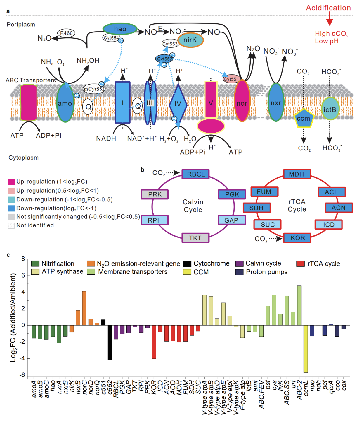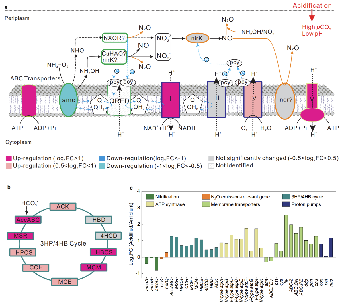 研究进一步基于宏转录组技术,从基因表达的水平上深入剖析了硝化功能微生物对水体酸化的响应机理,发现水体酸化会显著抑制氨单加氧酶基因(amo)、羟胺氧化还原酶基因(hao)、亚硝酸盐氧化还原酶基因(nxr)等硝化反应关键功能基因的表达,但对氧化亚氮产生相关功能基因的表达却呈现出显著的促进。基于跨膜质子转移相关基因的表达揭示了硝化微生物细胞膜内酸化的证据,发现硝化微生物会通过加速跨膜质子转运来维持胞内pH平衡以应对水体酸化的胁迫。此外,水体酸化也会显著影响硝化微生物化能自养固碳、反应基质跨膜转运等代谢过程,首次揭示了河口近岸复杂环境中水体酸化对硝化过程影响的分子机制。