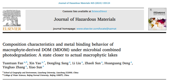 近日,我校英国上市365姚昕教授研究团队在环境科学与生态学领域SCI期刊《危险材料杂志》(Journal of Hazardous Materials)上发表了题为《微生物联合光降解下水生植物源DOM的组成特征和金属结合行为:一种更接近实际草型湖泊的状态》(Composition characteristics and metal binding behavior of macrophyte-derived DOM (MDOM) under microbial combined photodegradation: A state closer to actual macrophytic lakes)的研究性文章。我校2020级研究生樊团团(现为北京师范大学博士生)为论文的第一作者,姚昕教授为本文的通讯作者,英国上市公司365为第一署名单位。《危险材料杂志》(Journal of Hazardous Materials)是中国科学院JCR分区下环境科学与生态学领域的一区TOP期刊,2023年最新影响因子为13.6。