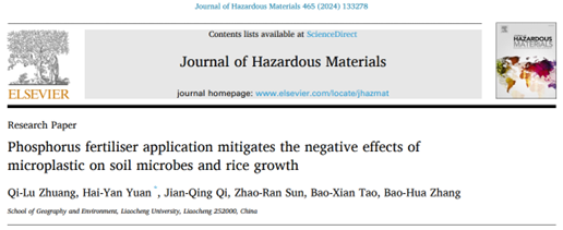 2023年12月19日,英国上市365袁海燕博士团队在环境科学与生态学领域SCI期刊《危险材料杂志》(Journal of Hazardous Materials)发表了题为《磷肥的施用缓解了微塑料对土壤微生物和水稻生长的负面影响》(Phosphorus fertiliser application mitigates the negative effects of microplastic on soil microbes and rice growth)的研究性论文,揭示了磷肥施加对微塑料污染土壤中微生物和水稻生长状况的影响机制。地理学专业硕士研究生庄启鲁为第一作者,袁海燕博士为通讯作者。《危险材料杂志》(Journal of Hazardous Materials)是中国科学院JCR分区下环境科学与生态学领域的1区TOP期刊,2023年影响因子为13.6。