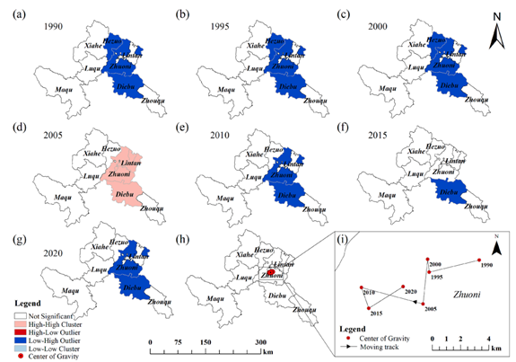 绿色发展是一种人与自然和谐相处、实现社会和经济可持续发展的有效途径。然而,影响高寒草甸地区绿色发展的因素具有复杂性和综合性。本研究以甘南藏族自治州为例,通过构建绿色发展水平评价指标体系DPSIR模型,评价研究区1990-2020年的绿色发展水平,并基于GeoDetector分析了其关键影响因素。研究结果表明,甘南州绿色发展总水平呈上升趋势,向高质量、可持续发展方向发展。除2005年外,绿色发展水平的空间集聚特征没有表现出明显的高空间自相关值;绿色发展空间集中稳定,重心在卓尼县。研究区生产生活、社会生产影响和积极的政策响应是促进绿色发展的主要因素。本研究结果为高寒草甸地区生态安全和绿色可持续发展提供理论依据和案例支持。